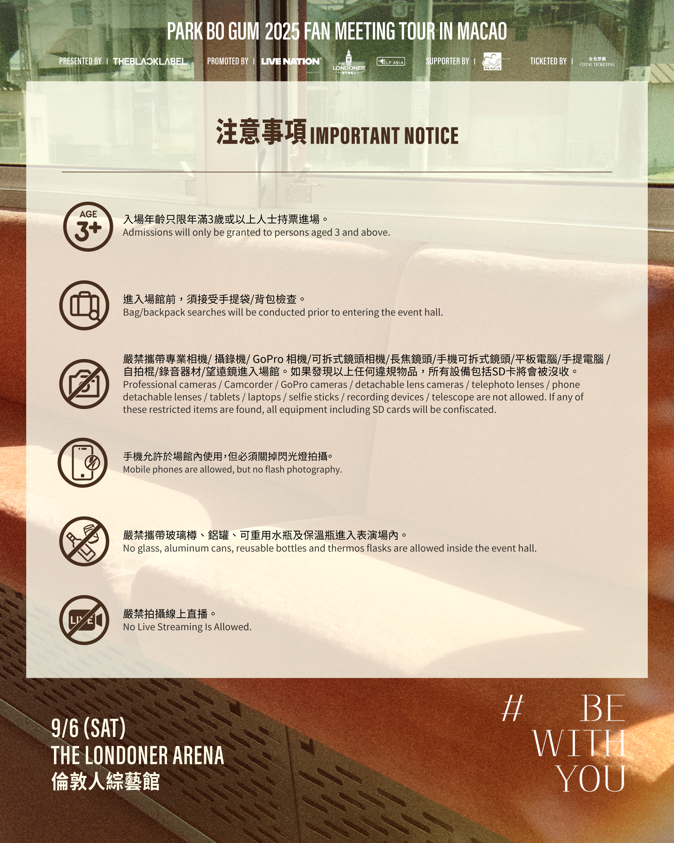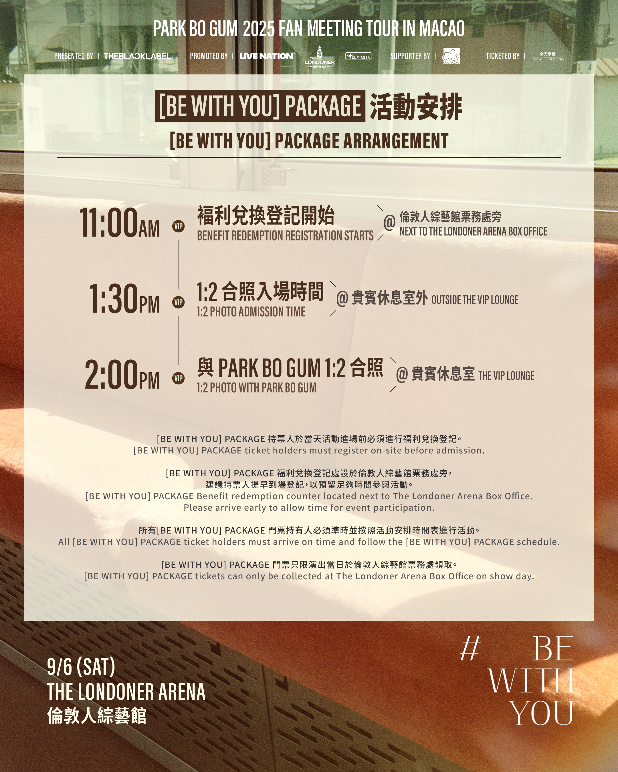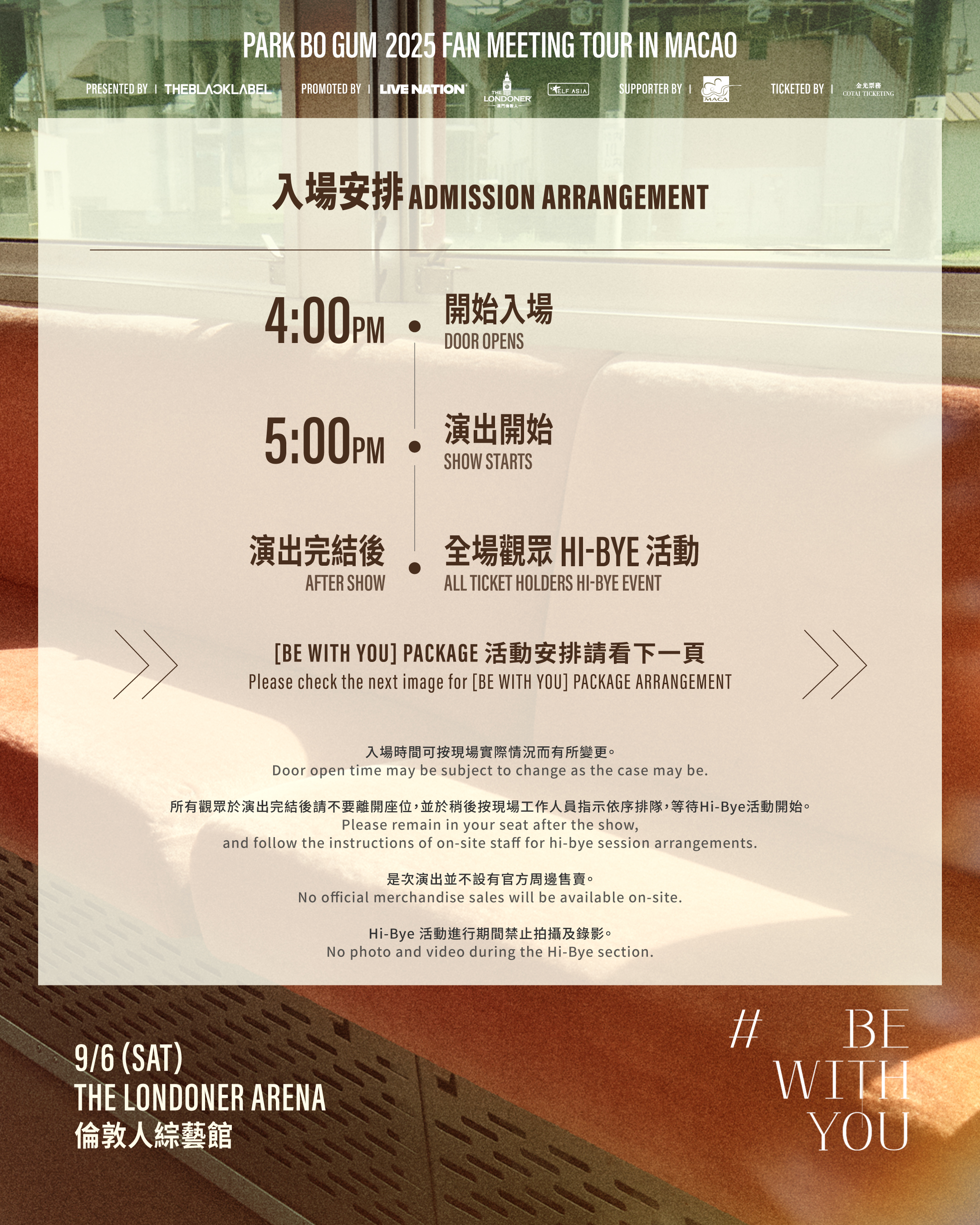 • 本次活动成功交易的A及B区门票可于2025年8月25日起至演出当天于售票处营运时间内领取 ; [BE WITH YOU] 套票只限演出当日於伦敦人综艺馆售票处领取。